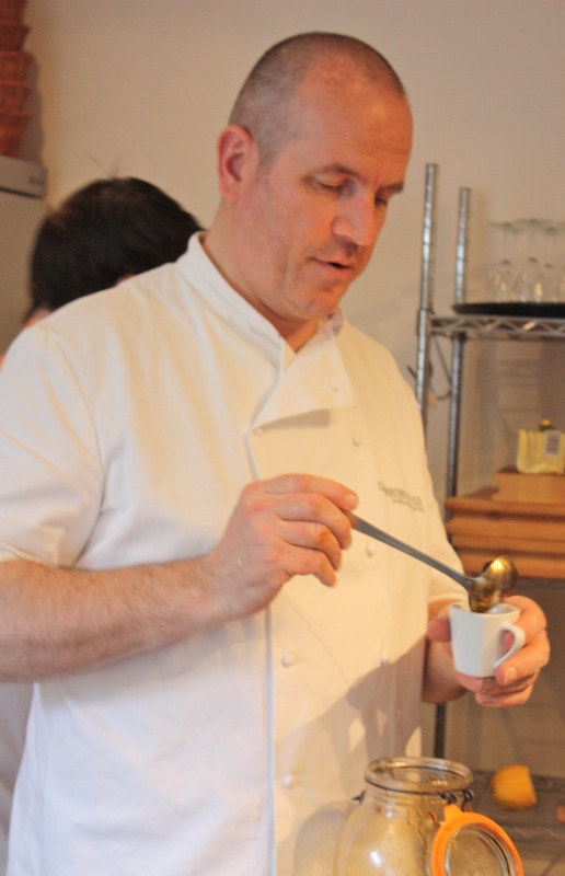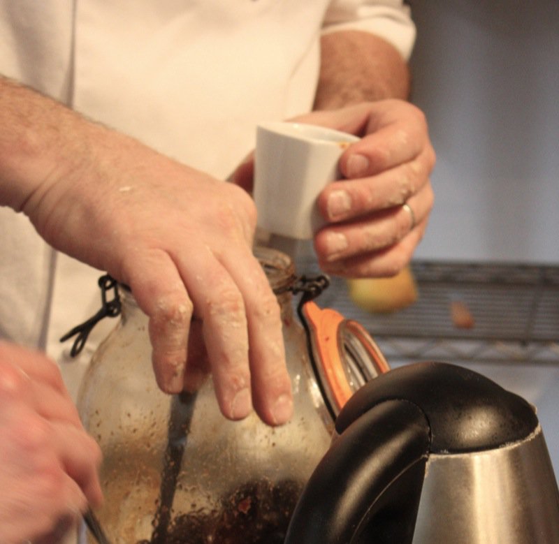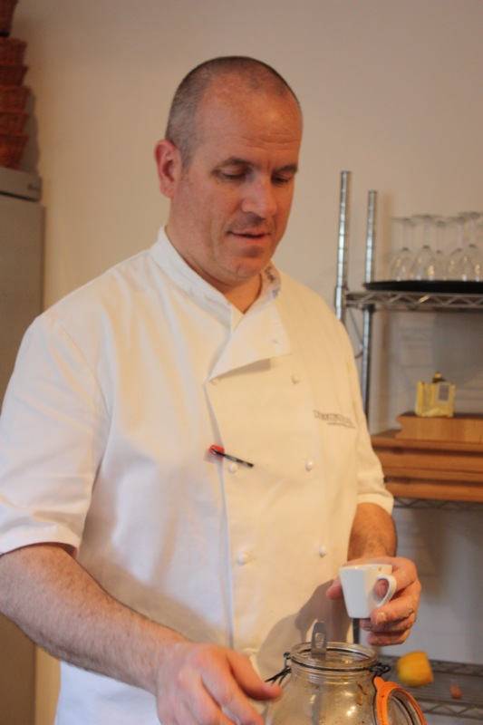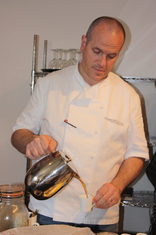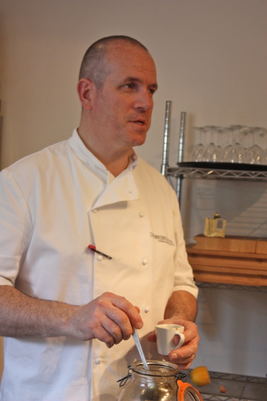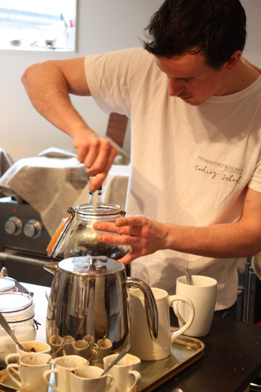 We discuss the experience and our learning and clean our hands and our board and Richard is calling us up to the front again. “Time for some sustenance! There is nothing like a little French coffee to wake you up and we have fresh Hot Crossed Buns for you! ( The class was just before Easter weekend) The coffee was poured, the buns munched and camaraderie ensued. Then, with a wicked little twinkle in his eye, Richard dipped deep into a massive jar and pulled out what was clearly a treasure of some sort and plunked it into the first empty coffee cup. “What is it?” Oh, no! You tell me. I am not telling you anything. You guess, and if you are right, then I will tell you. But, isn’t it delicious? Isn’t it delectable? Isn’t it? The cups were emptied quite a bit faster than they might have been. Arms extended forth. Each politely waiting turn for the plump dark mass that was plunked into our small cup.