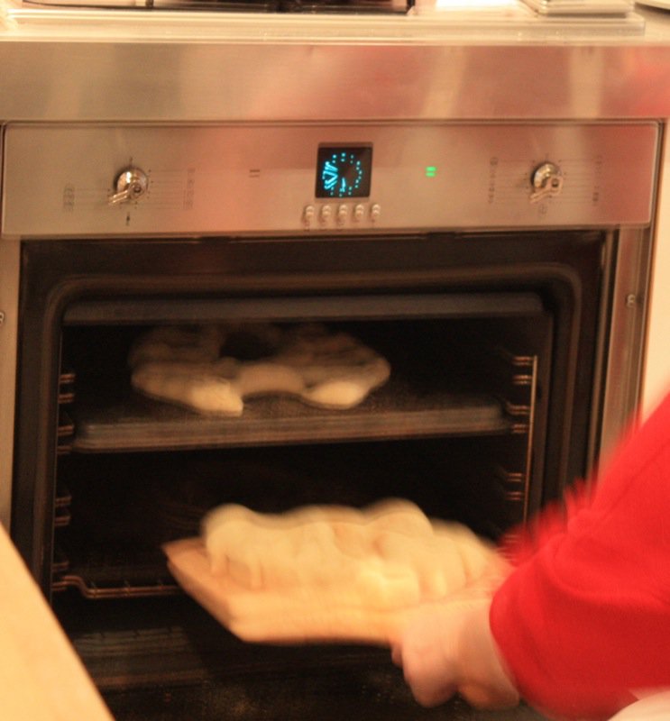 Bend down so you are eye level; open the oven and LET GO OF THE OVEN DOOR, then slide the Fougasse onto the preheated pan with a jerking motion, closing the door quickly. I did this three times and thought I had let go of the oven door. The third time, Richard knelt beside me, and gave me a look I had definitely not seen before: “Hello? Is anybody home?” I had still not let go of the oven door and truly thought I had. The lightbulb really went on at that moment. What a huge habit I had to work to over come if I was going to be able to slide my bread into the oven on a paddle. “Let go of the oven door.” You just cannot do it unless you have let go of that door.