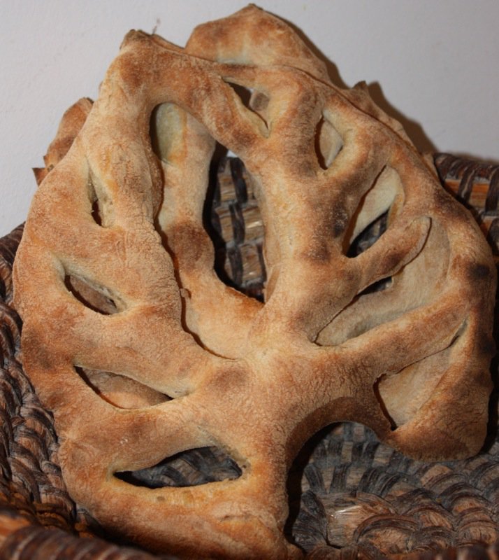 Look at the gorgeous crust on this Fougasse. It is a work of art. Below, left, you will see that Richard has sharply cut into the sides of the Fougasse between the inner slits out of the edge to add movement and appeal as there was room within the doughy shape of this one to do it.