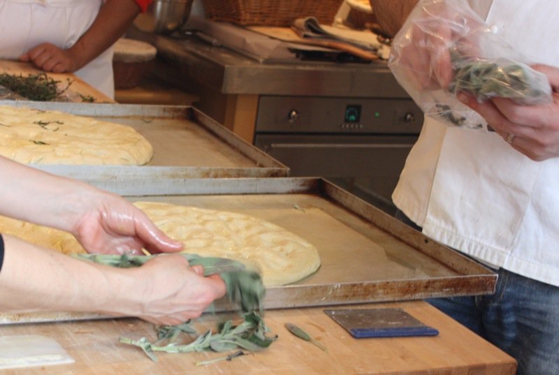 Each one was different: one was made with fresh sage leaves, olive oil and sea salt; the other, with fresh rosemary, lemon zest and sea salt. Both were fed a liberal lashing of extra virgin olive oil throughout the process and after proofing, just before going into the oven.