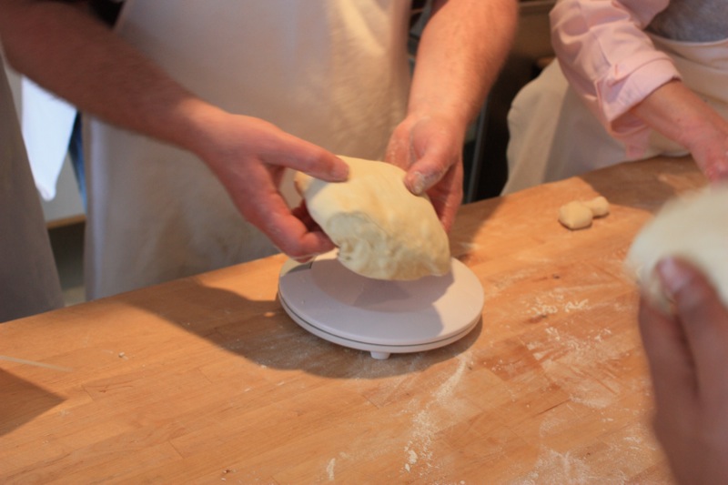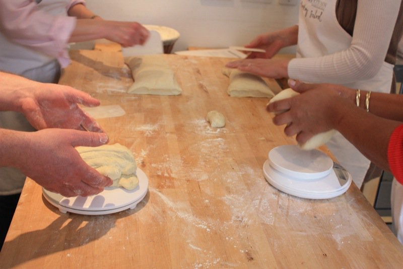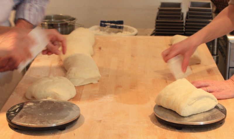 And the Master is a hands-on coach as he checks for consistency in weight of placement before we divide our dough.