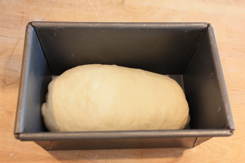 Fold each side into the middle like a baby’s swaddling blanket. Fold the top onto it, and the bottom up over the top. Then fold it over, and slip it into the pan to proof again until double in size.