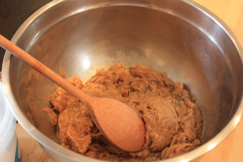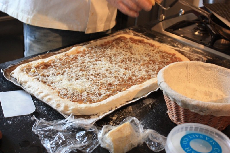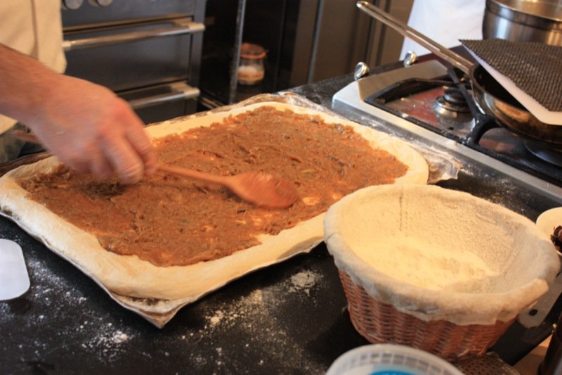 This is a man who knows to teach and to cook. He is a man after my own heart. He readies his dough, takes a drink, wastes not a hint of the onion topping using my favourite “money saving tool”, the rubber spatula to ensure every savoury morsel will be eaten and enjoyed.