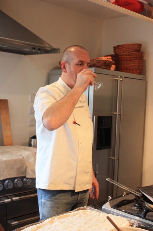 And suddenly the Focaccia is out of the oven being drizzled again with oil, and the entire room has been completely transformed without interrupting our instruction and enjoyment. I had noticed the quiet organizational change as the tables and chairs were brought out of the storage room at the back, but it was not an interference. And is was a brilliant use of space. Impressive to watch it all come together so quickly while we were sipping our wine (or water), nibbling our bread sticks, all yet completely mesmerized by our Master.