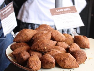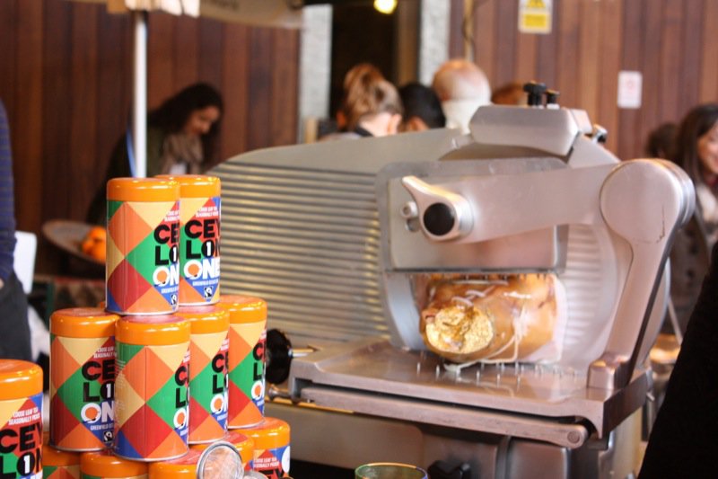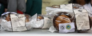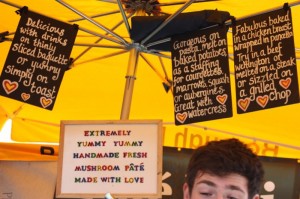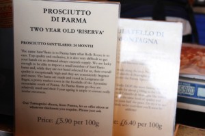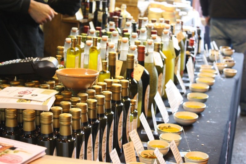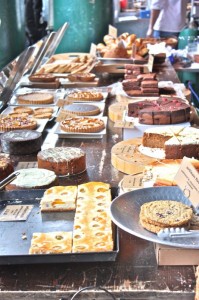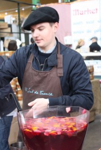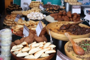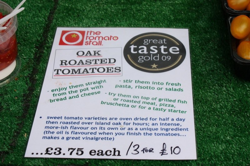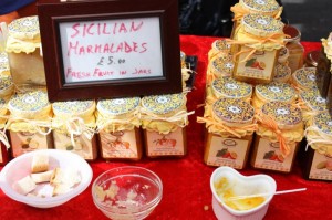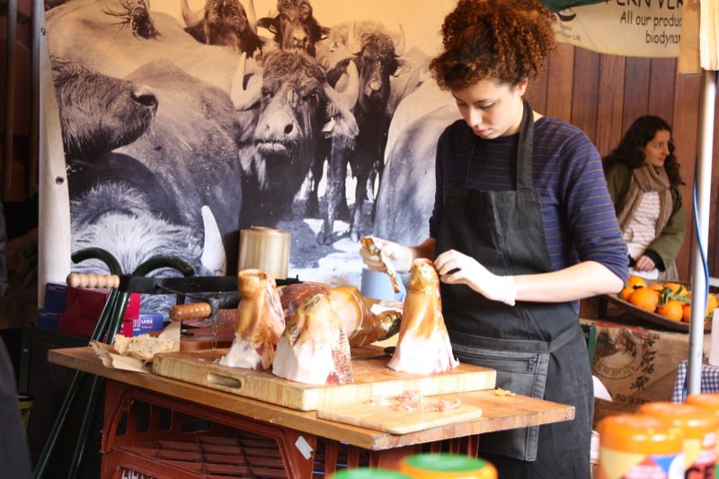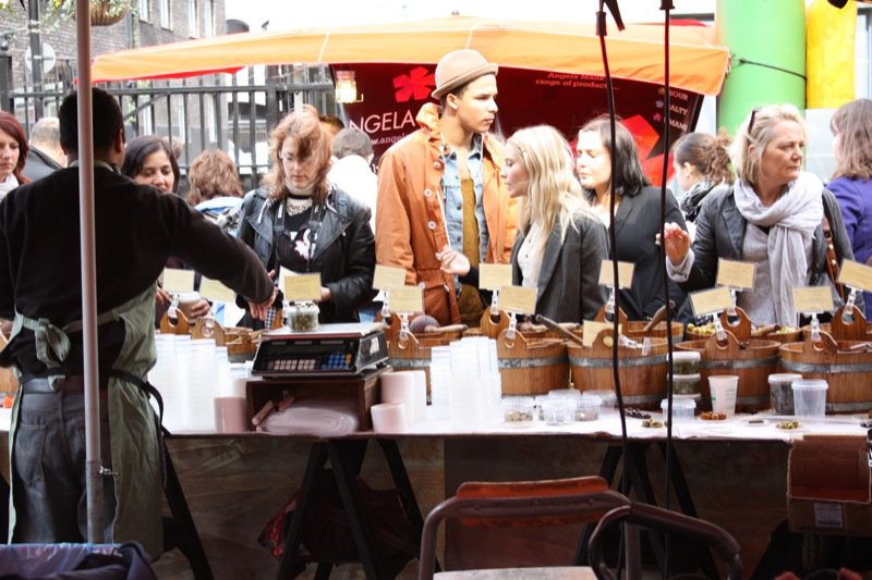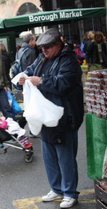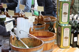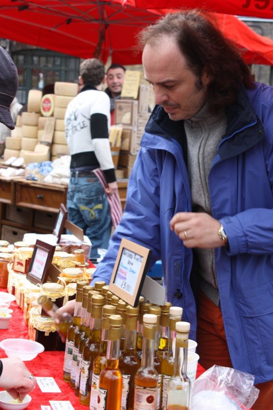Across from the mushroom paté, and beside the jamon and cheese booth, was the Sicilian Honey Man. He was a character, too. Very informative. He had six different flavours of honey and explained how each was created. Well, he tried, but was interrupted so many times. Finally, he just swiped the bowl of cheese samples from the booth beside him and gave me a taste of his orange honey with their cheese. Deadly! Truly. I was in, I bought the 4 sampler jars to be served with the cheeses I was bought at Neal’s Yard Dairy for mom’s tea. I don’t know how I will do it. I just know I must. (The cheese guys next door were ranting at him as I left and he returned their samples. He saw me watching and just grinned and winked.)