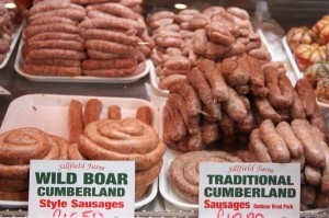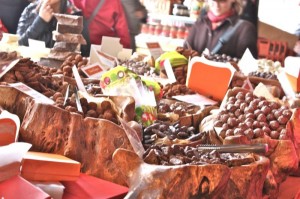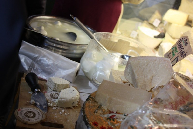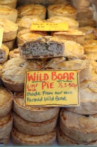 What an exciting market! Truly loaded with all kinds of meat, pie (wild boar pies sounds sensational), and rounds of cheese..I have never seen any cheese like that either.
