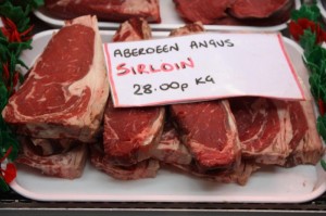 Look at these choices! The beef must be finished with barley here, too, as it is in Canada. The fat is glistening and white. In the USA, it is finished with corn, and the fat has a yellow hue. I have never had the opportunity to compare the flavour of each fat, though.