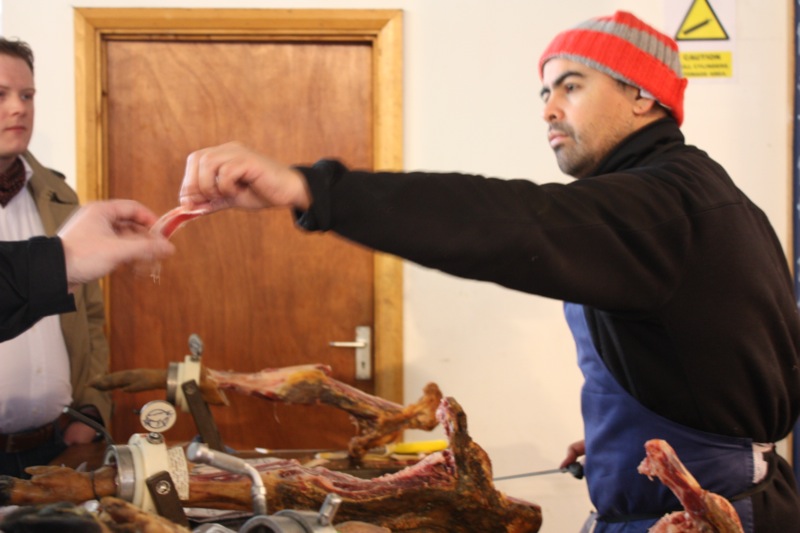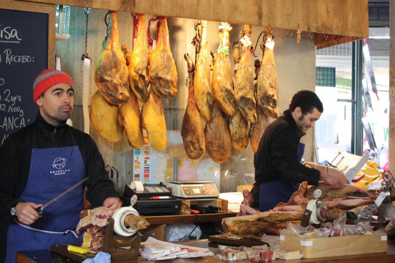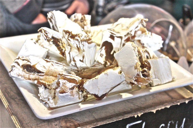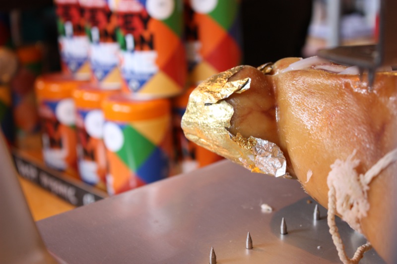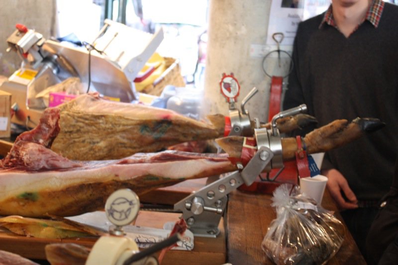 Everything in the shop was interesting to me. I have not yet been to Spain. As I have just done some tastings of the Jamon Iberico at home, I was very curious. Look at all of the different kinds of special cured hams! And, I have only seen the boneless. I had never seen the leg carved like this before. It is so much more primal and appealing. Grrrrrr! I was into it. The fellow in the red hat was surprised that I had tasted the 3 year acorn Iberico in Canada. He thought it was not exported to us. As he saw my interest, I got a sample of almost each… and he was very interesting. It was a slow moment… then a crowd came, and I remembered I had to move on. I wish I had taken notes, but what I do know is each was fantastic!