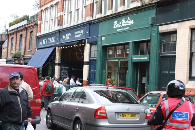 And here I am back where I started. Neal’s Yard Dairy is below in the blue on the right side of the street. Vanja is standing under the clock kitty-corner to it and is hungry and happy to eat and is completely over all of this. “How much longer do you need?
