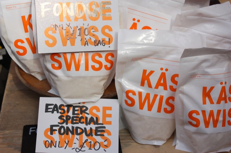 The Swiss cheeses were on sale for an Easter fondue. Lucky Londoners!