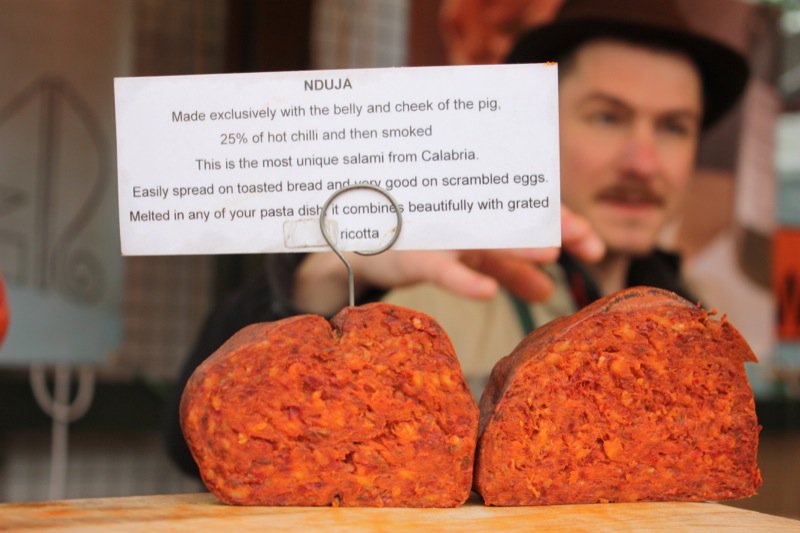 This is a patétype of spicy sausage from Calabria called Ndyja (read the sign in the message by double clicking to enlarge the photo). The sample was so tiny, yet the flavour burst and texture so appealing. It was made from the belly and the cheek of the pig with 25% hot chili and then smoked. I had to have some of this, too. How much? Hmmm… how much? Oh, I’ll take a whole one. (It would travel better than a portion.) I am glowing by now. Glowing. I cannot feel the weight of my bags.