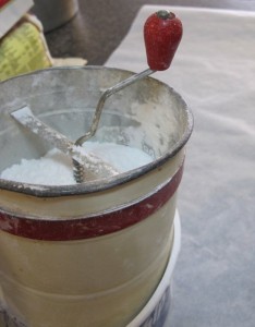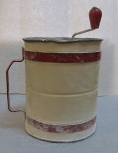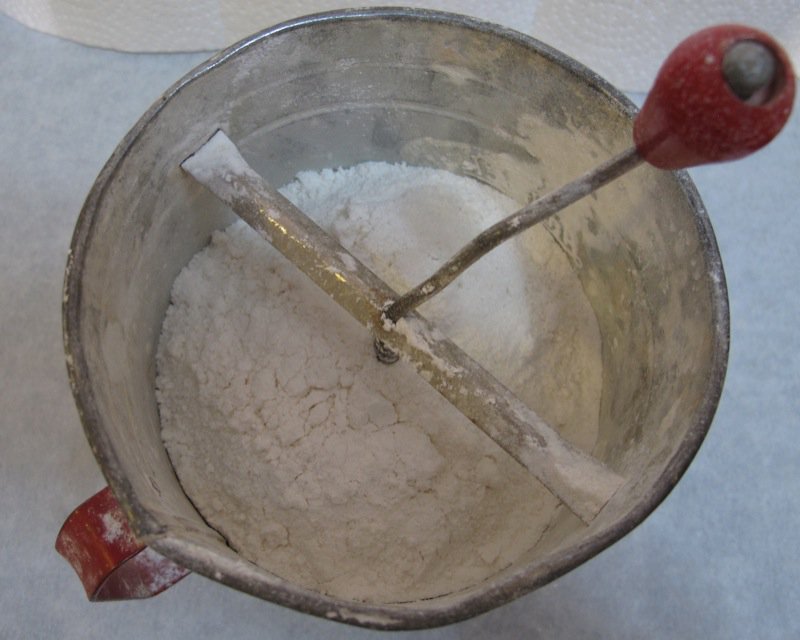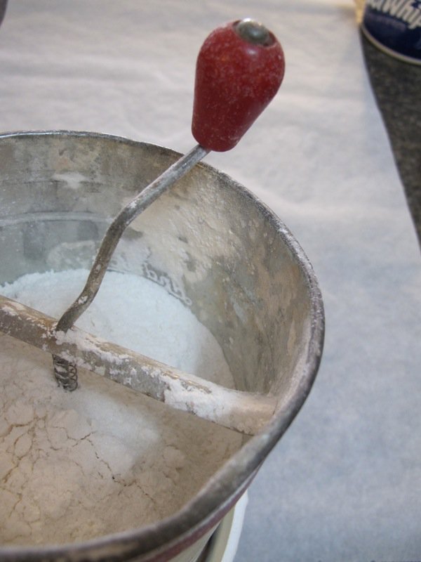 And I was charmed by this old family sifter. The beauty in this old rickety tin is found in the shadows of my memory where years flashback to my nose barely touching the counter and I see it at eye level. Even then, it was very old. It was fun to try to turn the handle and watch the flour fall like soft snow into a bowl. I remember that.