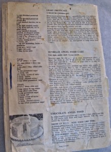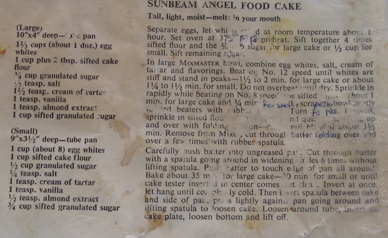 - one large angel food cake pan (if you have a small pan, the ingredient amounts for this are in the photocopied recipe, above)