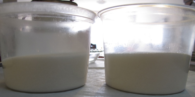 It is sitting in a Cool Whip container as the flour for the first cake has been sifted three times, and the flour for the second cake has been sifted twice.