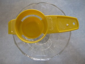 The sugar was measured. For both cakes. And this is how mom separates her eggs (below). Did I mention my mother was the Queen of Tupperware back in the day of the Tupperware Party? Everyone loved to invite my mom as she always needed the latest in Tupperware. She was a sure bet for a big bill. And, she still has every piece she ever bought in perfect condition. I wonder how much money vintage Tupperware goes for?