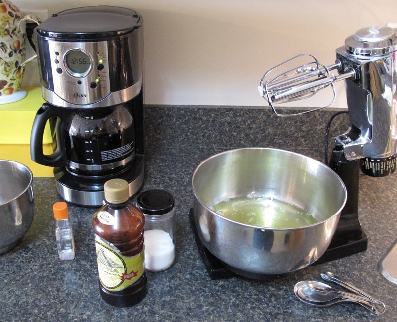 The Sunbeam. The infamous Sunbeam. Egg whites waiting. Machine rearing, ready for take-off. Mom’s coffee pot full and empty by the time we finish.