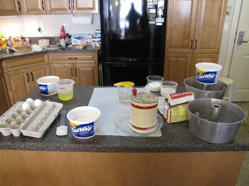 Mom has everything ready for my homemade angel food cake demonstration. Completely ready. There is no one more organized than Helen. Except, maybe George (my dad).