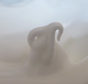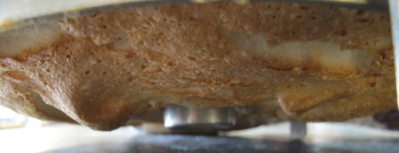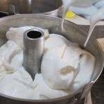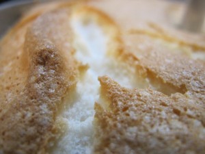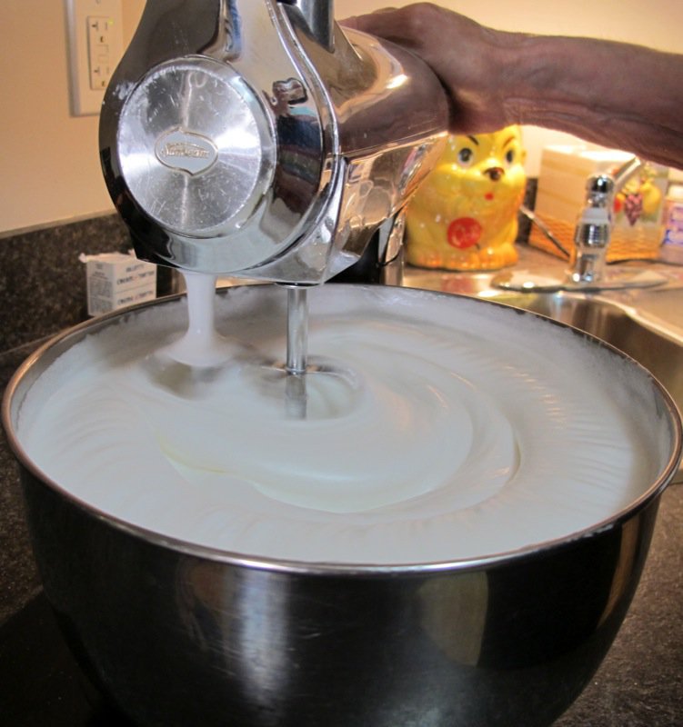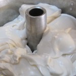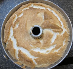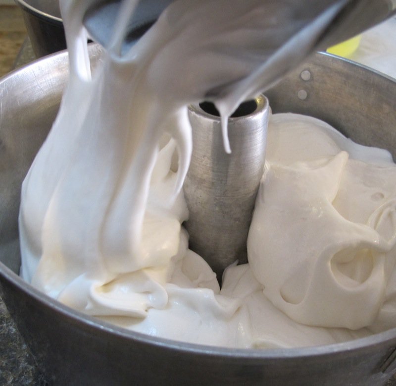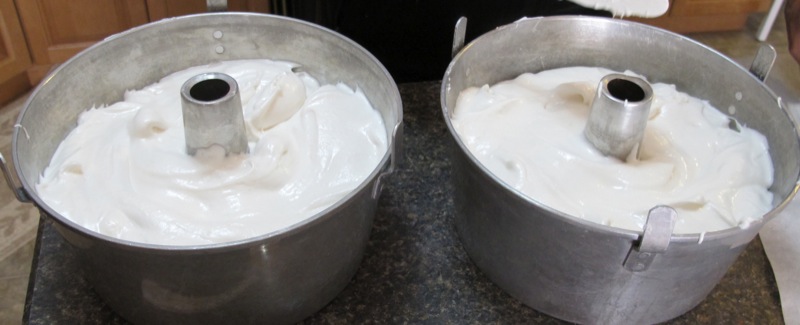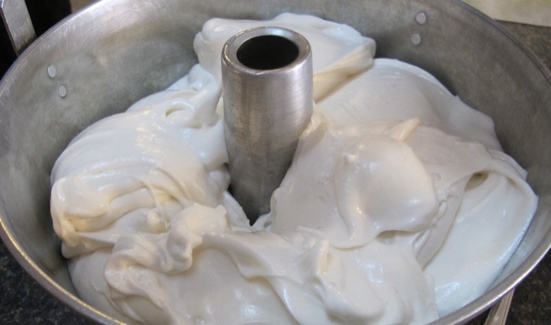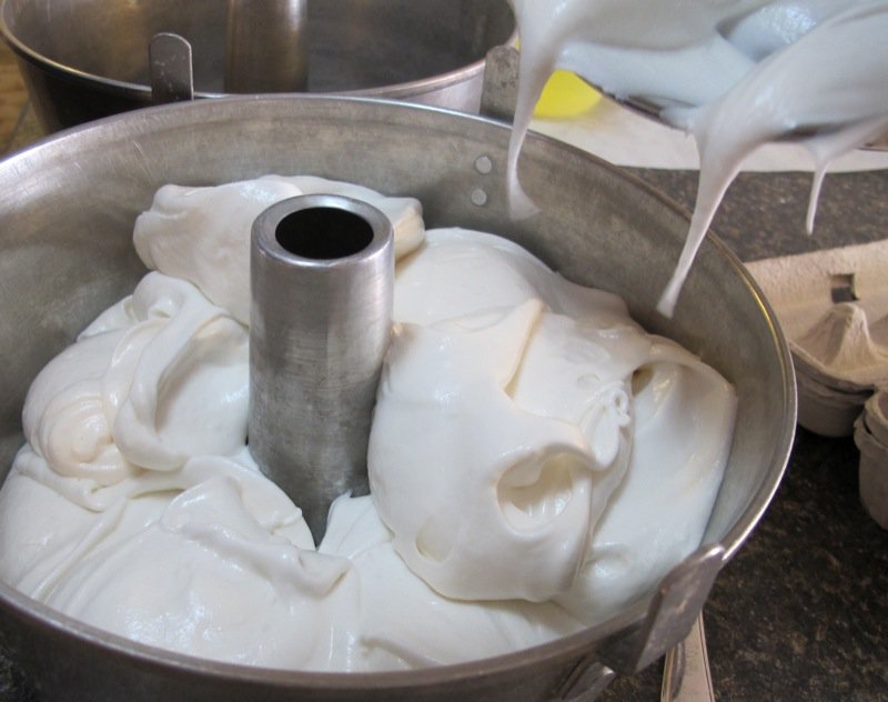 Then, ever so gently, lifts the beaters out of the bowl, still turned on low to expel the remaining whites, and is done. Into the ungreased and aged angel food pan, it goes.