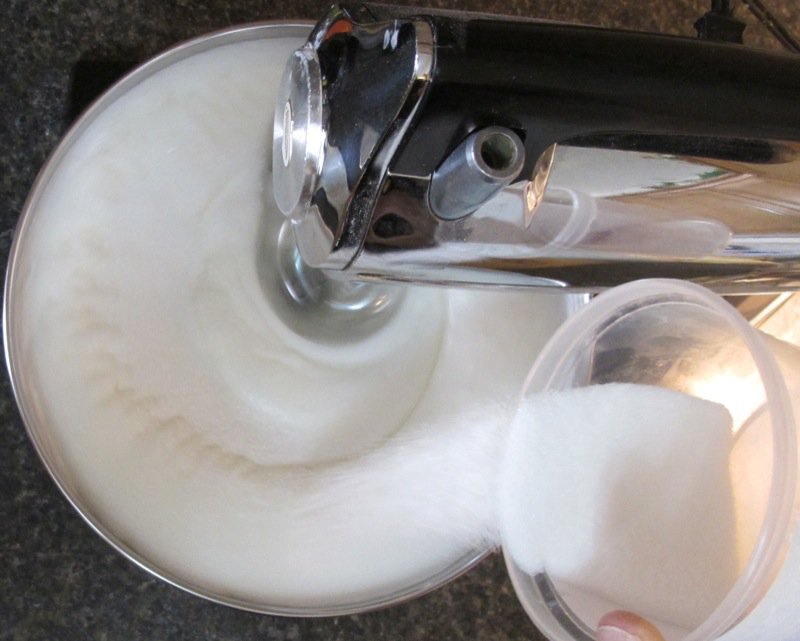 - Sprinkle in rapidly, while beating (number 8 speed) the sifted cup of granulated sugar (about 1 minute); scrape the bowl gently toward beaters, as necessary