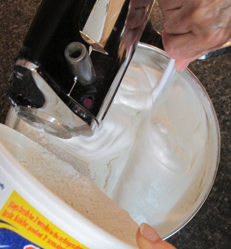 Mom is checking to see how stiff the whites are. One of the advantages of this masterful Sunbeam is that the blades stay on the far side of the bowl, not in the middle, and mom is able to fold the flour into the whites on the open side of the bowl without much danger of engaging the beaters. Not quite ready.