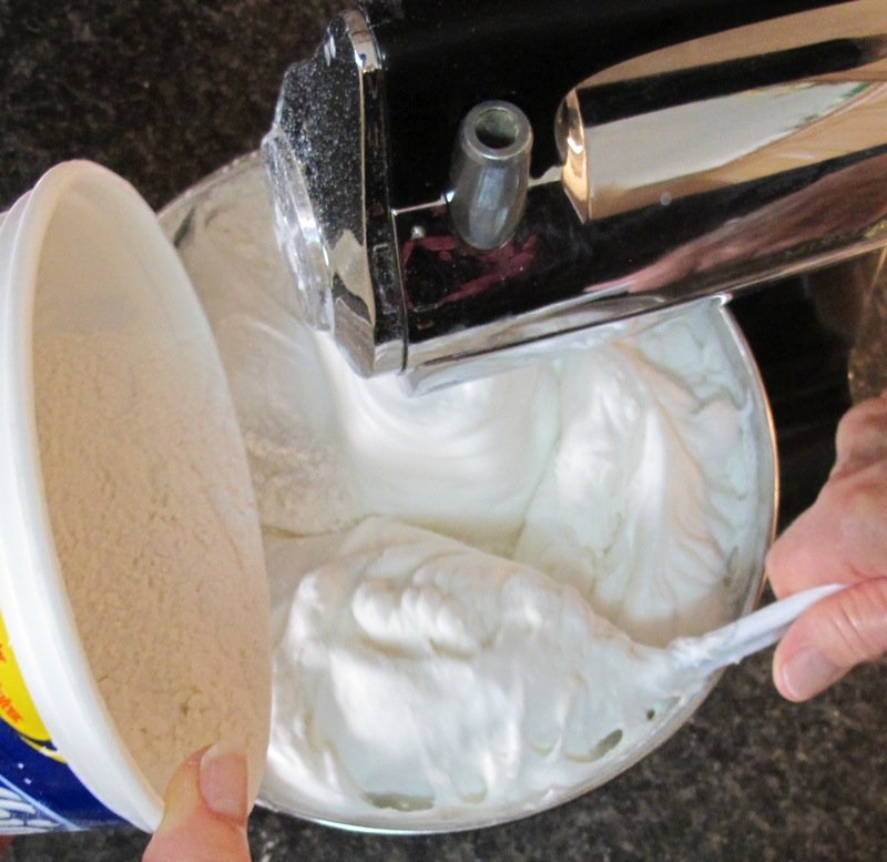 - Turn speed to very low, and sprinkle in sifted flour-sugar mixture slowly, folding into the whites evenly using the up and over fold motion (about 1 and 1/2 minute)