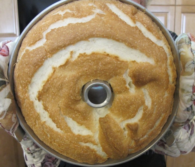 I am back in the nick of time. The cake is coming out of the oven. Look at that gorgeous crust in mom’s mitted hands! And here is the other homemade angel food cake.
