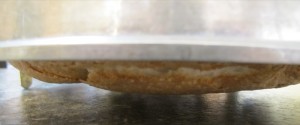 She then places a plate on top of the cake that is exactly the same circumference as the cake (which makes it very easy for icing, later), and turns the cake over on it.