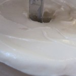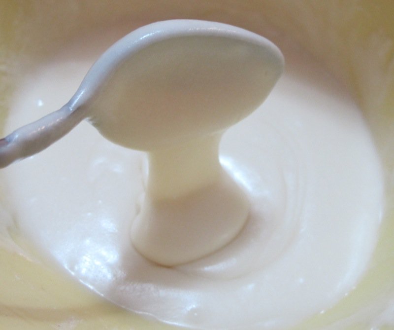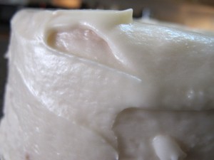 The recipe and instructions for this icing follow, but it is important to note that this is the consistency she looks for. Basically, mom says: “Dump half a bag of icing sugar in a bowl (about 3 cups), add a good clump of room temperature butter (about 3/4 cup). some flavourings (1 teaspoon each of vanilla and almond extract) and just enough boiling water to make it spreadable after beating like hell by hand! LOL LOL!” Yes, she is a cyber-mama, too!