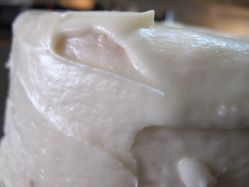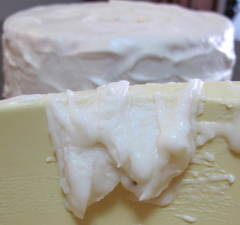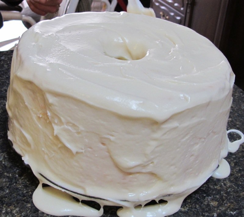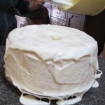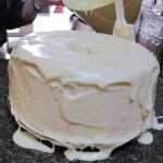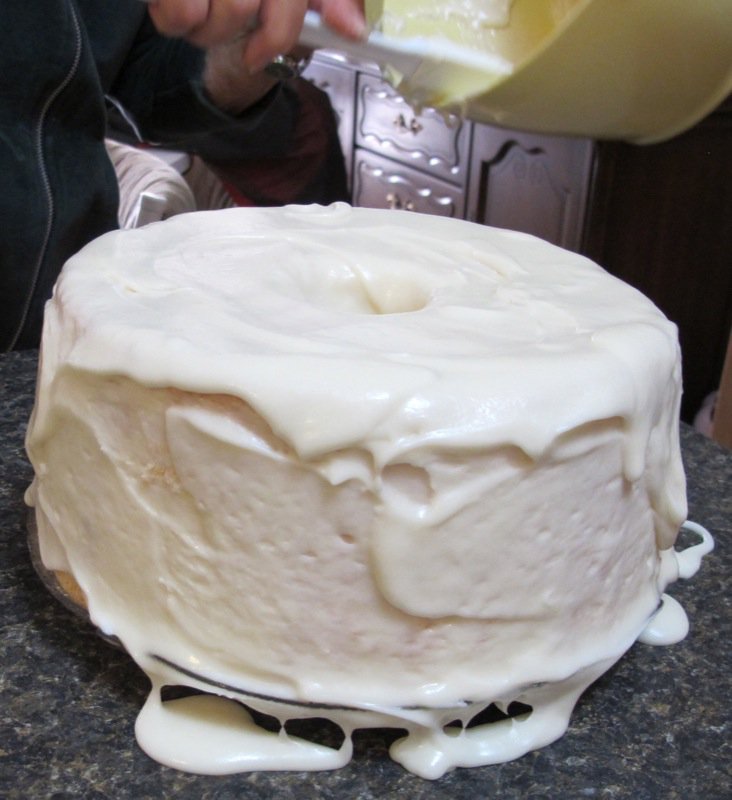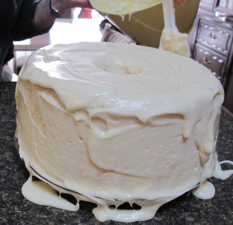 Then, as you can see, she ladles the icing over the top of the cake and works is around the sides.