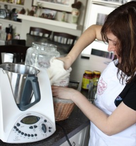 And then we started right away. We used the Thermomix for most of the kneading, but we did work (not knead) the Red Fife loaves the way I learned from my Bath classes. I wanted to teach Maria what I had learned, and definitely wanted to learn what she had learned. We started with the white flour first, and made two in the Thermomix without a photo. Then we used the Thermomix to weigh the Red Fife, and worked the dough by hand.