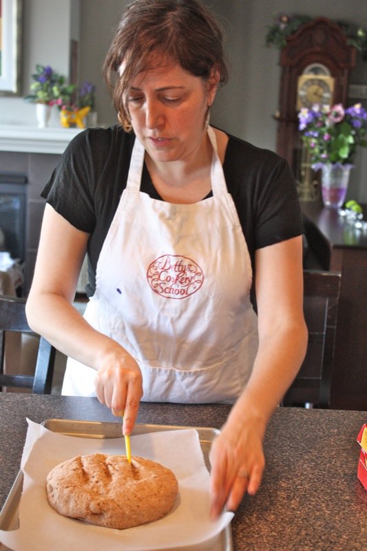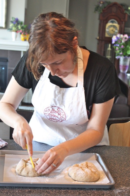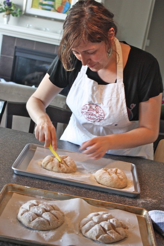 Then Maria showed me how to score the loaves to make cobbles on the top like the cobblestone walks in Yorkshire. This was really fun to do, and I was wishing I could find the lames I bought at the Bertinet Kitchen. I bought three, and cannot find them anywhere! There is nowhere to buy them in Edmonton. Anyone know of anywhere closer than the UK?