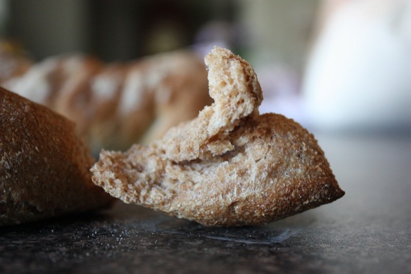 The other white loaf was proofed in a round banneton and plopped beautifully onto the parchment was also left in its proofing shape. All round loaves were put into the oven with a paddle onto a preheated surface and had crisp crusts. YUM. The Swiss Stick, and the Epis were put into the oven on the trays each was shaped on.
