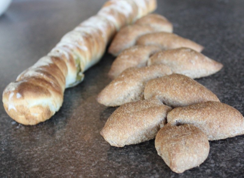 That’s when I found my rye. I knew I had some somewhere, and we needed rye flour for the traditional Yorshire Cobble Bread. We made one batch and divided it into four for two of each. We made one Swiss Stick with white flour and filled it with pitted Sicilian olives from the Italian Centre Shop South. I filled and twisted it exactly like we did our bread sticks at my cooking class in Bath, but this one was much larger, so it was softer and lighter and so lovely. There was no need to take photos of the Thermomix kneading (sorry, Richard – “working”) our bread, but I have included some of us shaping the dough.