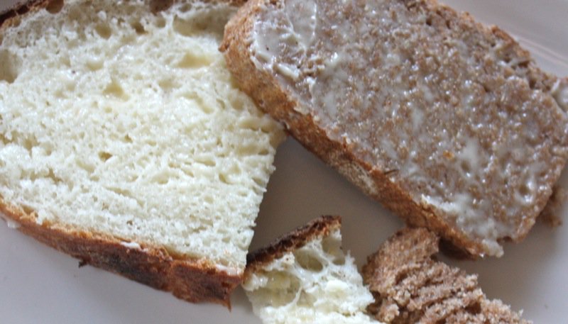 One of the white loaves just plopped onto the parchment paper so beautifully, we decided to leave it like that. Beautiful. And it would have been even more gorgeous baked, if I hadn’t scorched the top. It didn’t taste burned. But, it looked burned. One or two minutes in a 500ºF oven can make a big difference to the final product.