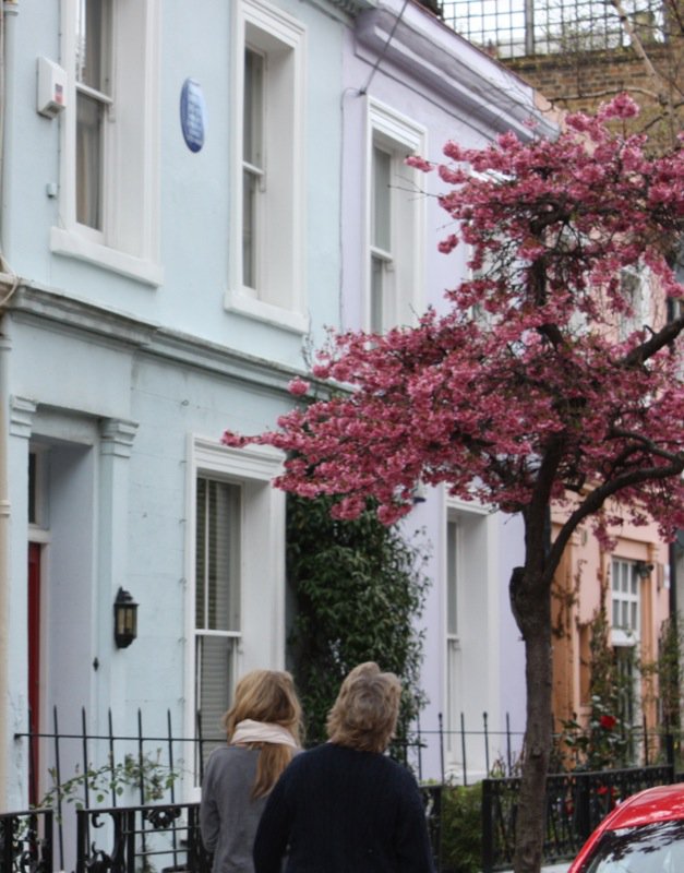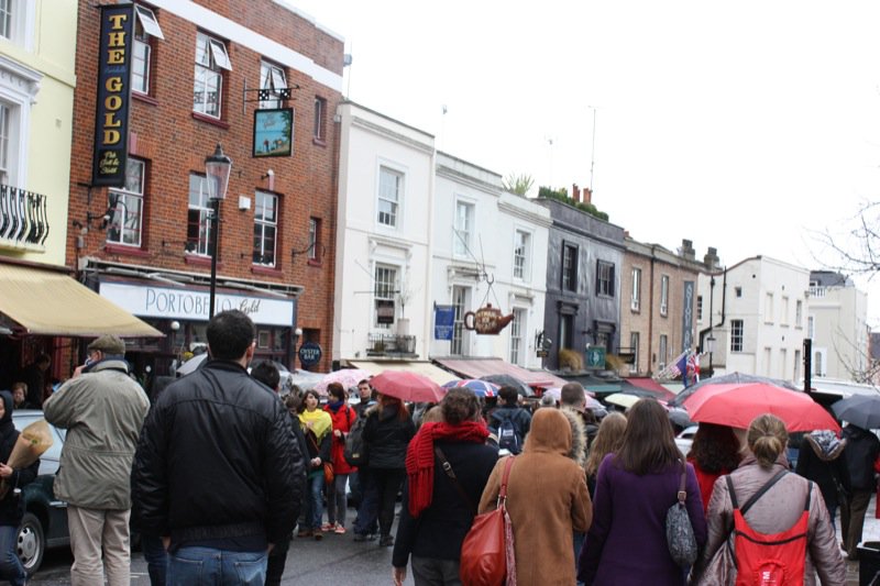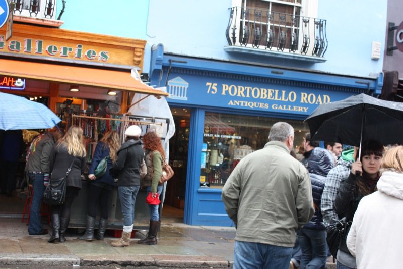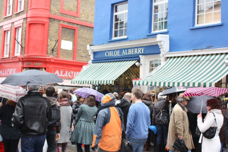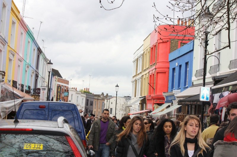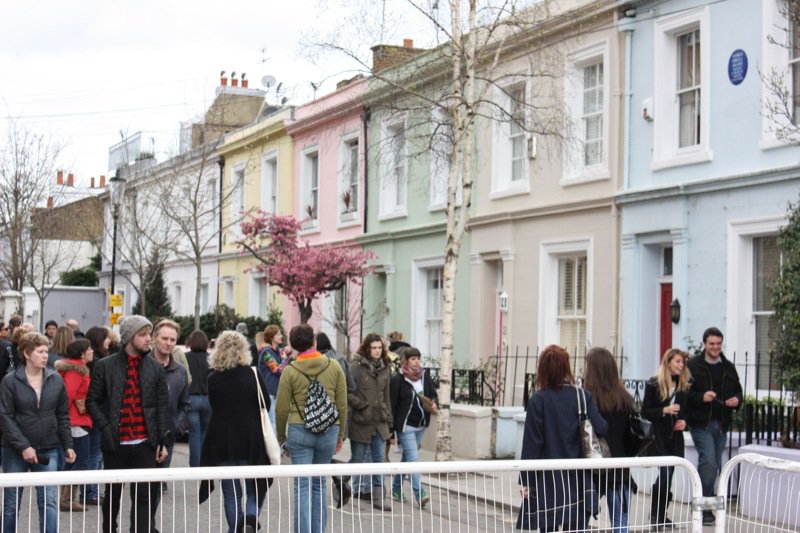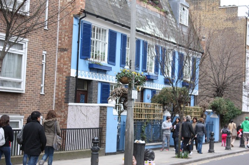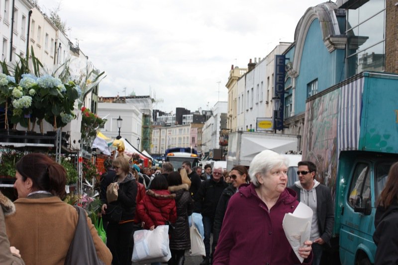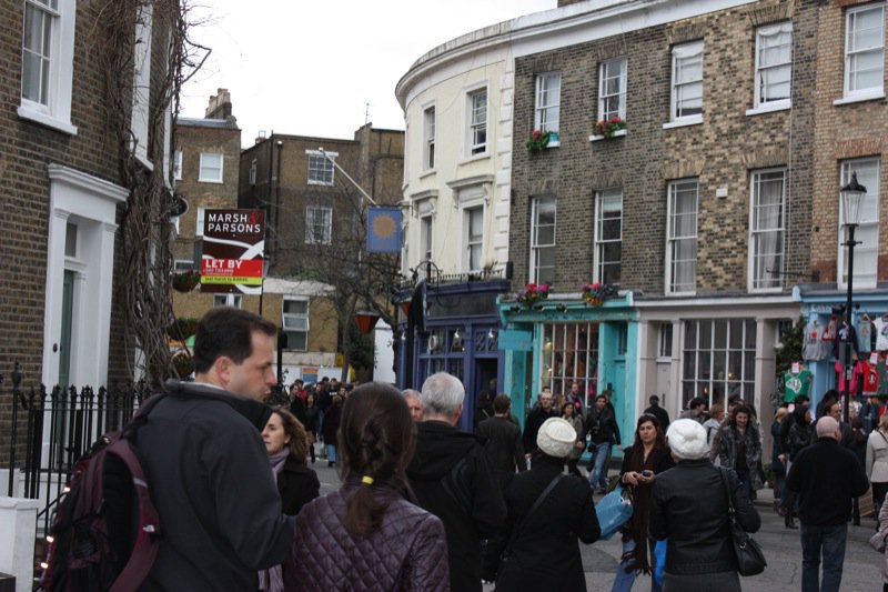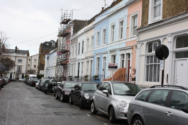 After my Underground adventure, and it truly was that: very easy to follow and find where to go, but a maze of deep escalators and levels of service, I arrived at Notting Hill Station. I could not believe I had just arrived in London, and here I was already! I pumped up the stairs and out into the fresh, cool London drizzle and breathed it all in. Nothing looked too “Londony”. There was even a Burgar King across the street! I followed my instinct from my earlier map search and crossed that street and went over a block and then asked where I would find the market. “Just keep going down the street, and it is around the corner.” I looked up, and this is what I saw on the street I had just come into. I was excited. This was looking very “Londony”!