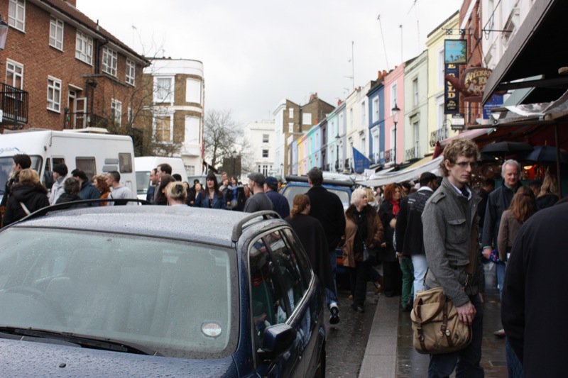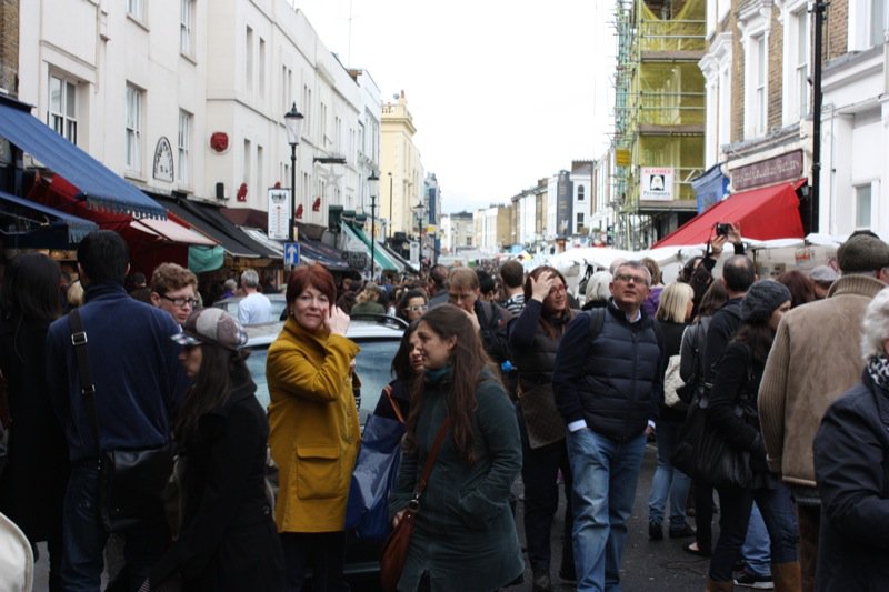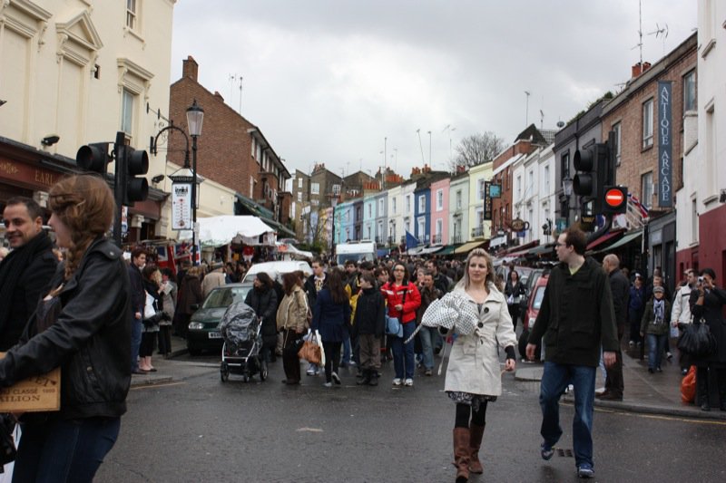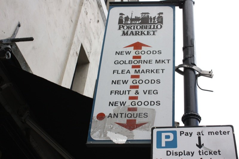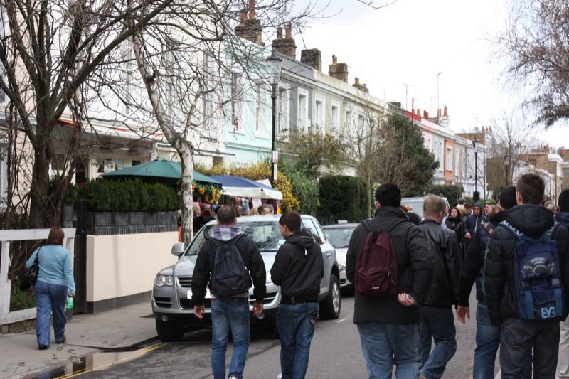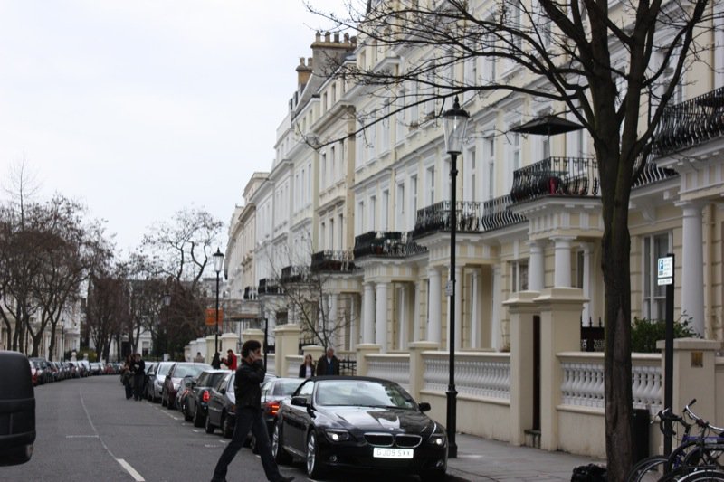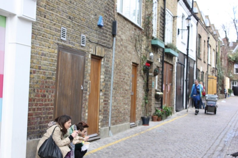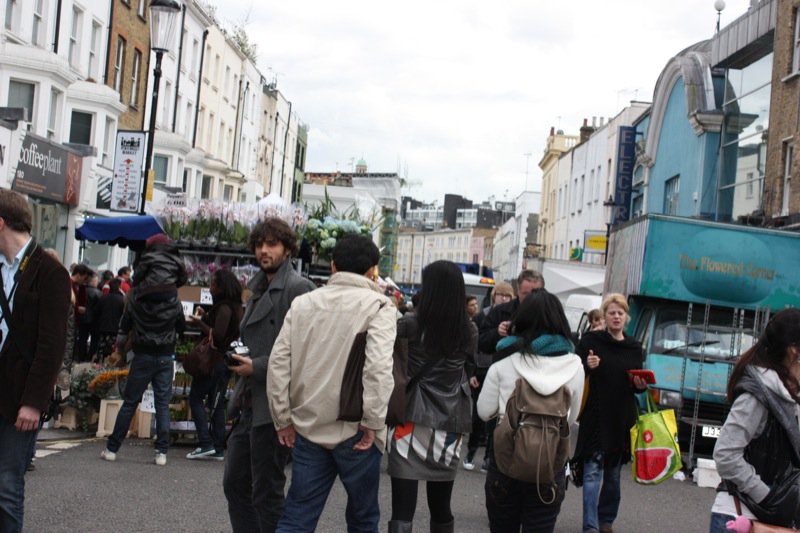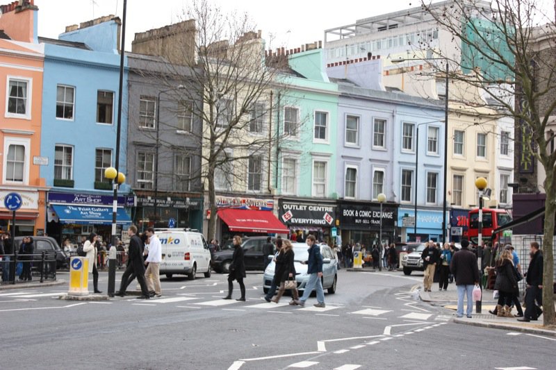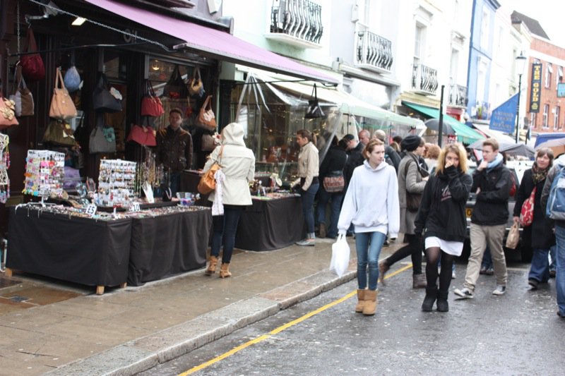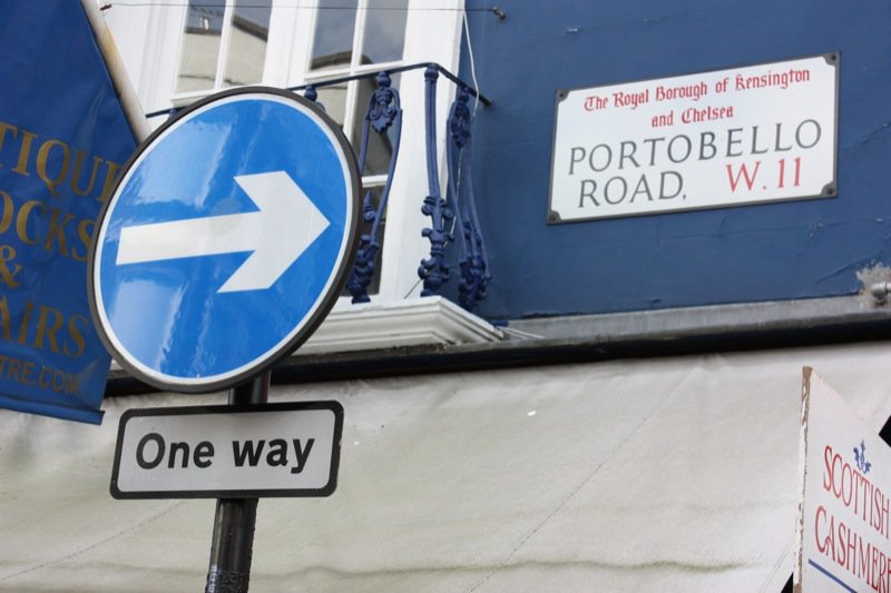 After my Underground adventure, and it truly was that: very easy to follow and find where to go, but a maze of deep escalators and levels of service, I arrived at Notting Hill Station. I could not believe I had just arrived in London, and here I was already! I pumped up the stairs and out into the fresh, cool London drizzle and breathed it all in. Nothing looked too “Londony”. There was even a Burgar King across the street! I followed my instinct from my earlier map search and crossed that street and went over a block and then asked where I would find the market. “Just keep going down the street, and it is around the corner.” I looked up, and this is what I saw on the street I had just come into. I was excited. This was looking very “Londony”!