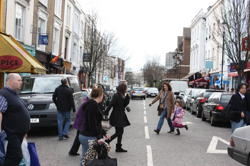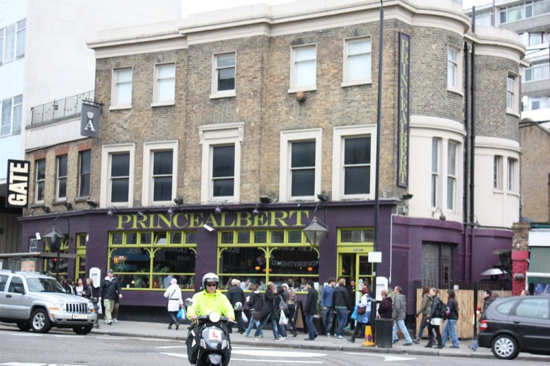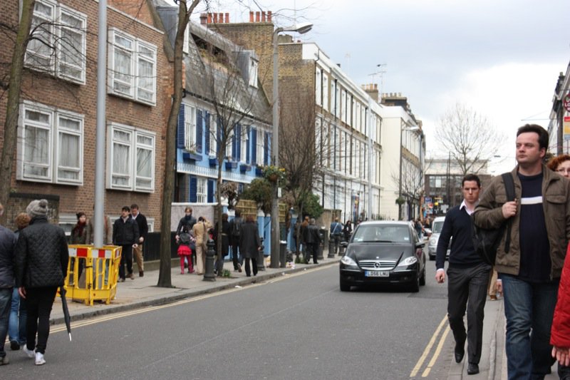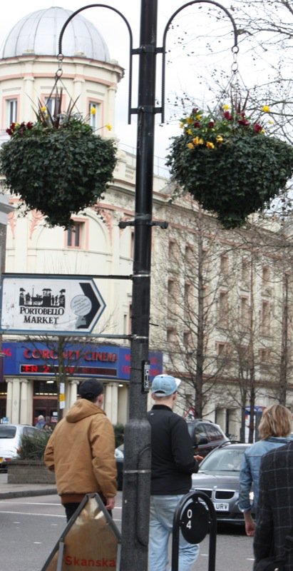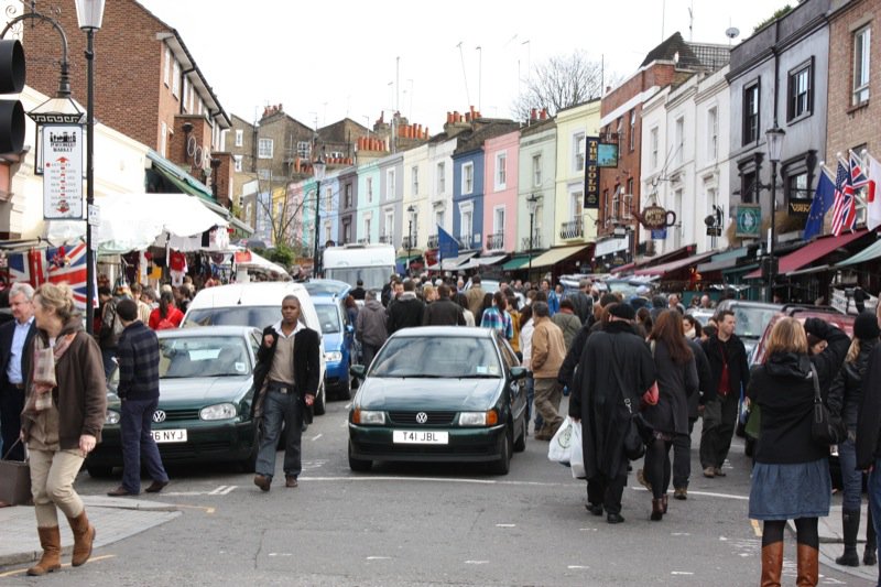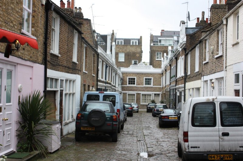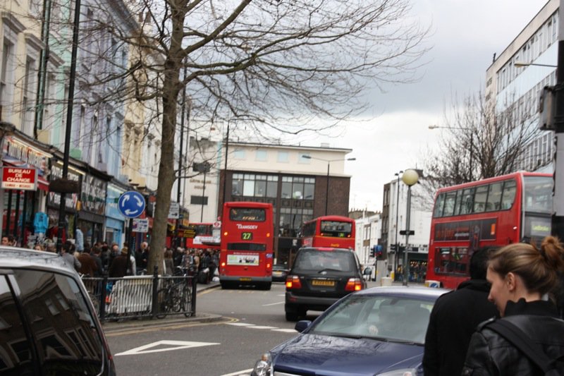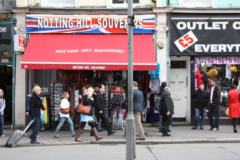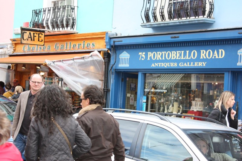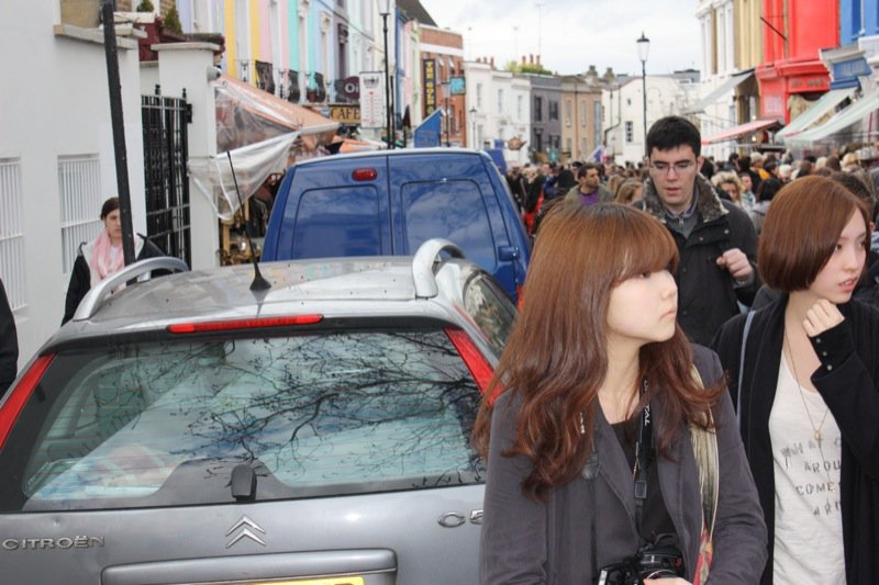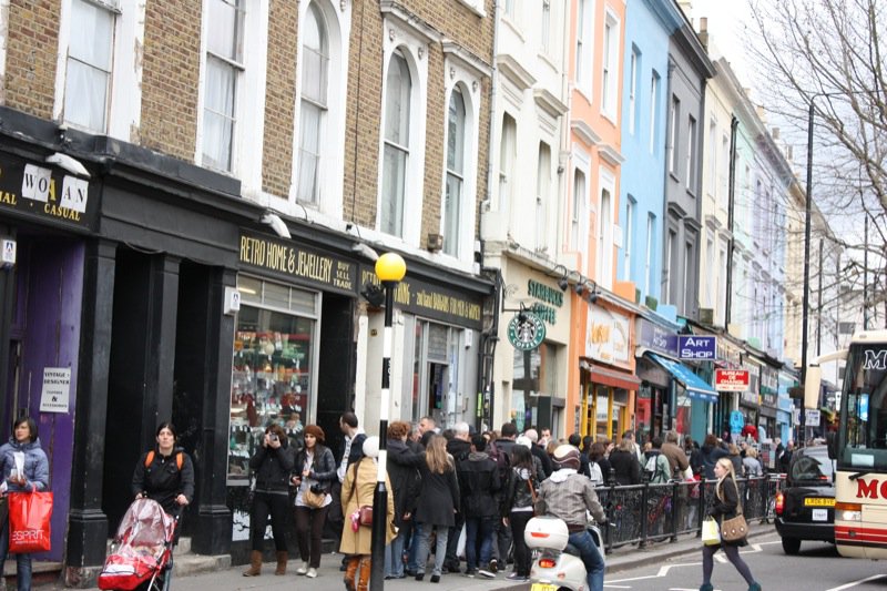 After my Underground adventure, and it truly was that: very easy to follow and find where to go, but a maze of deep escalators and levels of service, I arrived at Notting Hill Station. I could not believe I had just arrived in London, and here I was already! I pumped up the stairs and out into the fresh, cool London drizzle and breathed it all in. Nothing looked too “Londony”. There was even a Burgar King across the street! I followed my instinct from my earlier map search and crossed that street and went over a block and then asked where I would find the market. “Just keep going down the street, and it is around the corner.” I looked up, and this is what I saw on the street I had just come into. I was excited. This was looking very “Londony”!