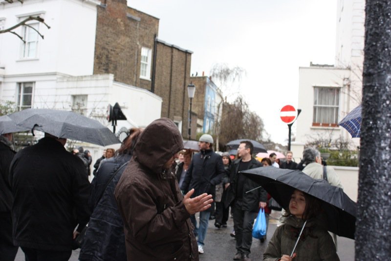 I was not expecting such a crowd on such a grey day. I loved the British Flag umbrella. I was around (in junior high school, actually) during the British fashion rage all over canada and North America. After the Beatles hit the air, they were followed by a long line-up of British music groups. Stores filled with clothing decked out in pop culture icons and symbols: the British Flag being a hugely popular pattern at that time. Doc Martens had just hit the market way back then shortly after, Elton John was wearing his platforms. This was the Britian of my childhood inside of my head. It was not the Britian of today. But, the umbrella awakened that longing within.