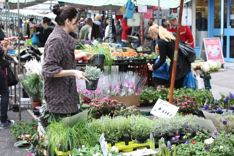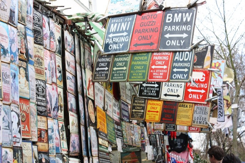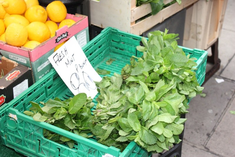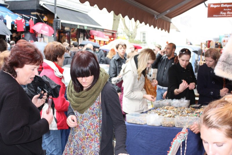 I kept walking and walking, away from the colourful busy street, down a very quiet and lovely residential street after turning the corner… for quite a long while. Eventually (and fortunately at the perfect moment, right at this Kensington sign), I met a gardener working on a flower bed and asked again for directions. He grinned and pointed to the busy line of people a block behind me up the street. If you look, you will see them right behind the green box, just past the sign. Hilarious. And, more luck. I was actually at one end of the beginning of the market.