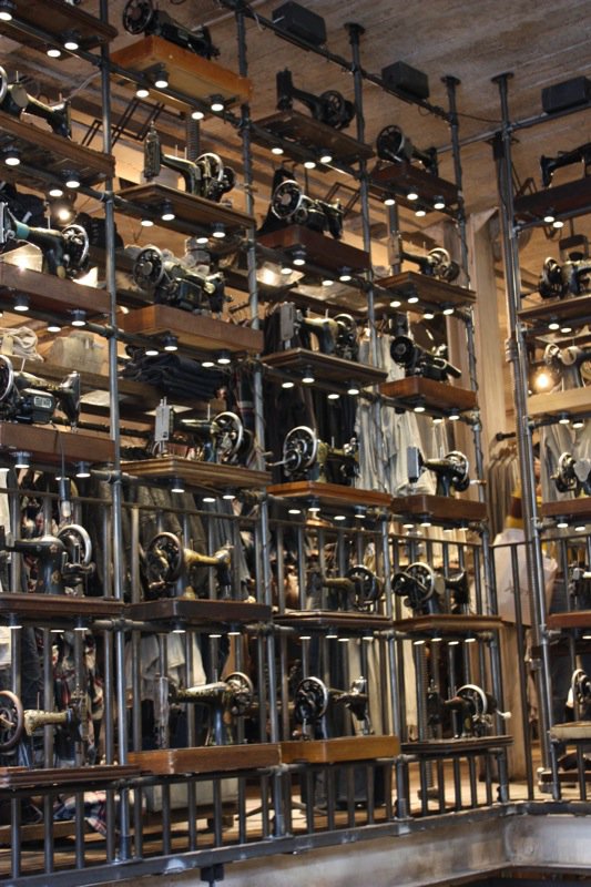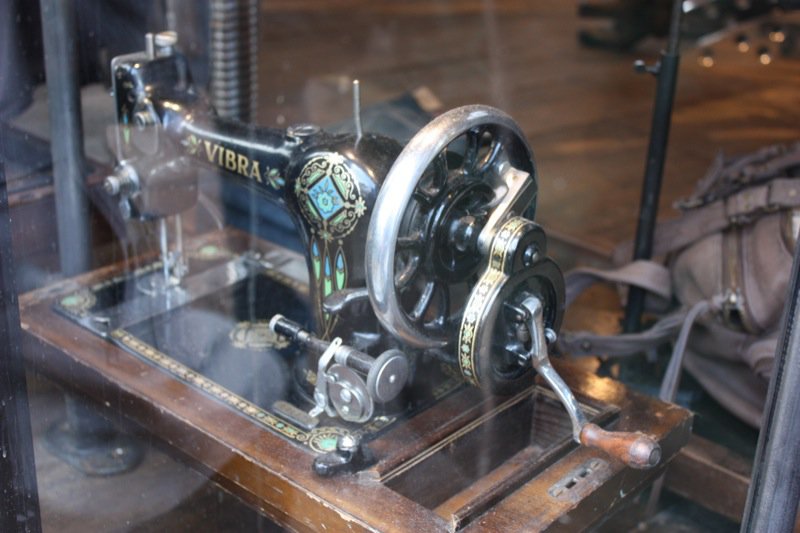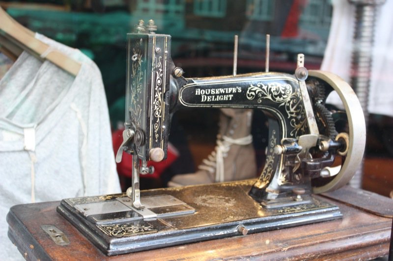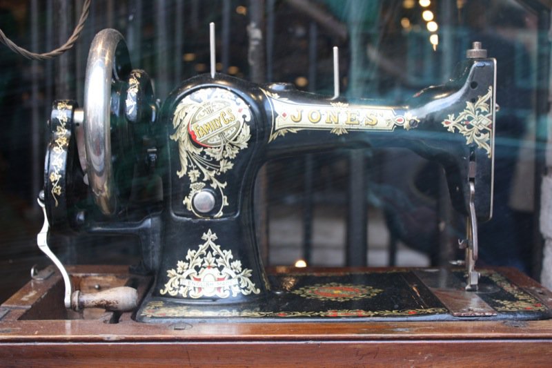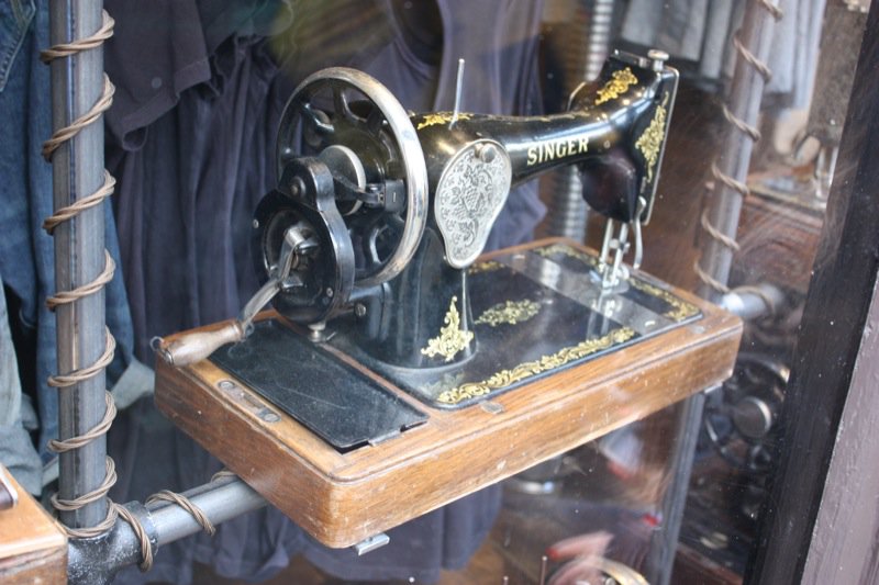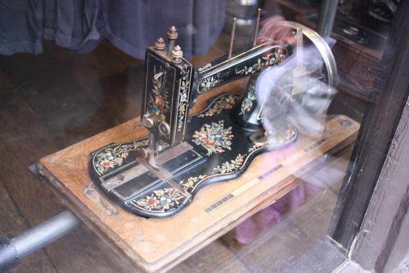 A crowd at a corner with noses pressed against the glass drew me over to see what the attraction was. Sewing machines. Hundreds, maybe thousands, of vintage and antique Singer sewing machines. Instantly captivated, and face to face with my grandmother’s old treadle machine brought spontaneously forward from the depths of my memory, I found my nose pressed against the glass, too, investigating the various beauties.