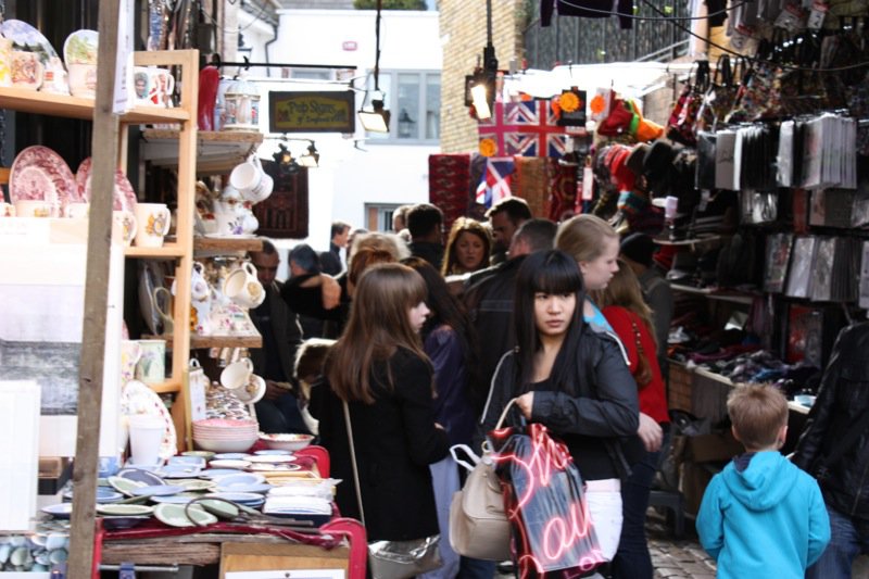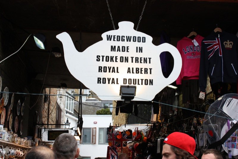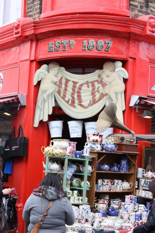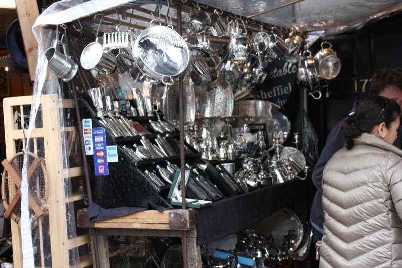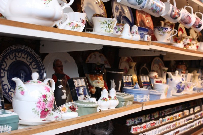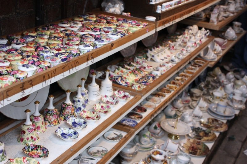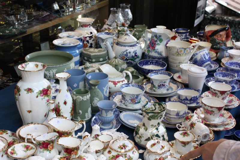 A little side street nearby was brimming with china of all kinds. Precious porcelain pieces all lined up row upon row upon row. I didn’t see anything in the Sweet Pea pattern that I so love. I didn’t look intently for it. But, the collectibles that are incredibly expensive on e-bay, I am sure can be found here somewhere. Everything else was here. Wedgewood was in abundance; Royal Doulton’s old patterns piled like waterfalls.