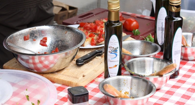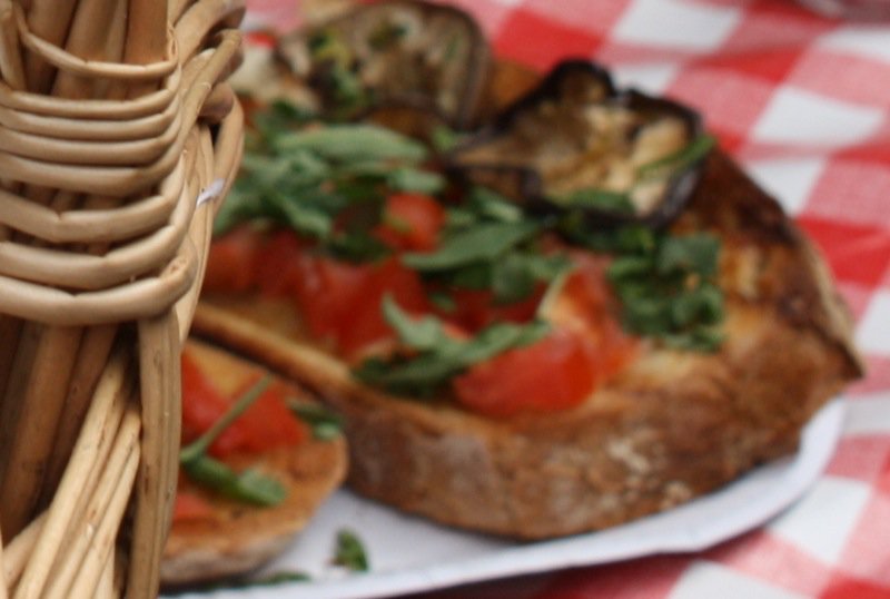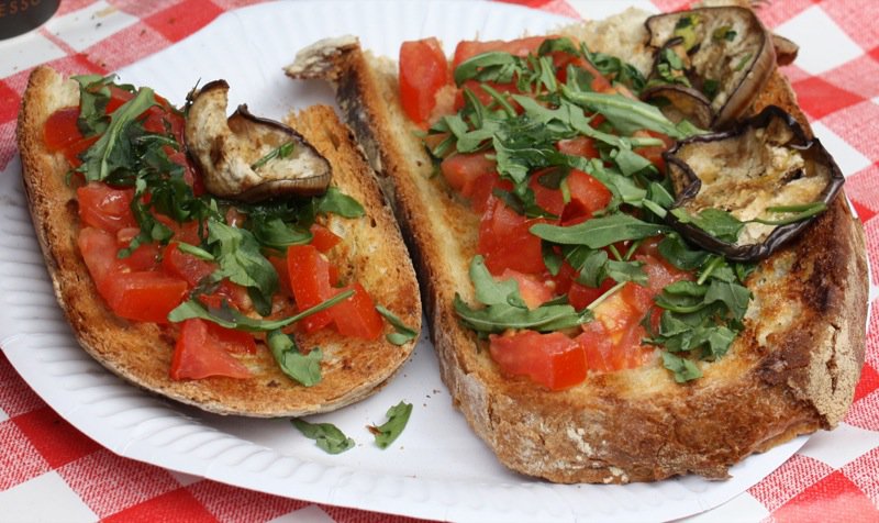The Tomato Basil Bruschetta caught my eye. I think I have never seen bruschetta that was as rustic and wholesome and as desirable. No one sells this at an open booth in an Edmonton Market, yet it was completely appealing. A perfect burst of fresh farm flavours for a snack at a market like Portobello where you are walking and shopping. There was an impressive stack of the most wonderful over-sized loaves of crusty brown bread at one end of the table. There was a hefty basket bulging with fresh ripe glistening tomatoes. There were stacks of large fragrant lush green basil leaves, plump and tender. The baby arugula was pristine and perfect, layered in a large bowl. Bottles of fruity extra virgin olive oil and thick balsamic vinegar erect on the table. Each serving, as below, was made to order, and cost five pounds.