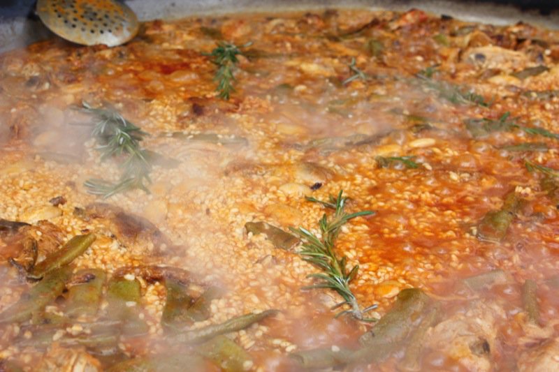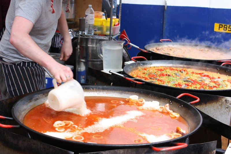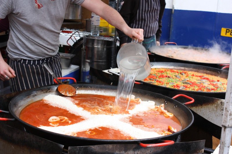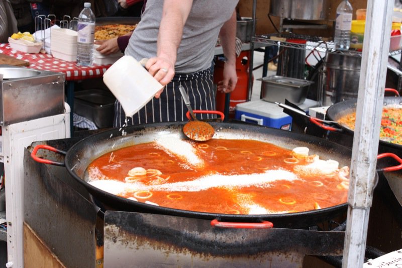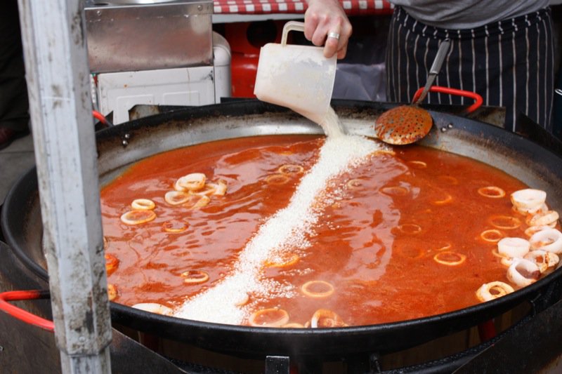 The one in the foreground with the squid has just had all ingredients (rice and water, above) added to it. The others are ready to serve. The gal making this, tastes it to ensure the flavour is still strong. The savory sausage and rosemary paella looks so creamy and the mussels with shrimp, green peas and red peppers looks magnificently flavourful.
