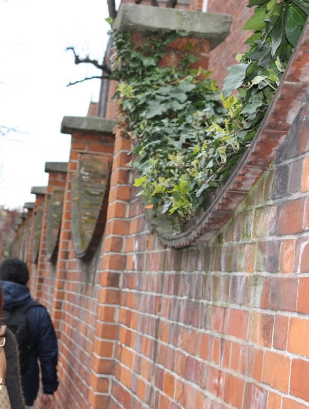 I follow the crowd down the pretty street. Many walking in the middle of the narrow road. I, on the sidewalk peering into little English gardens and feeling the moss on the bricks.