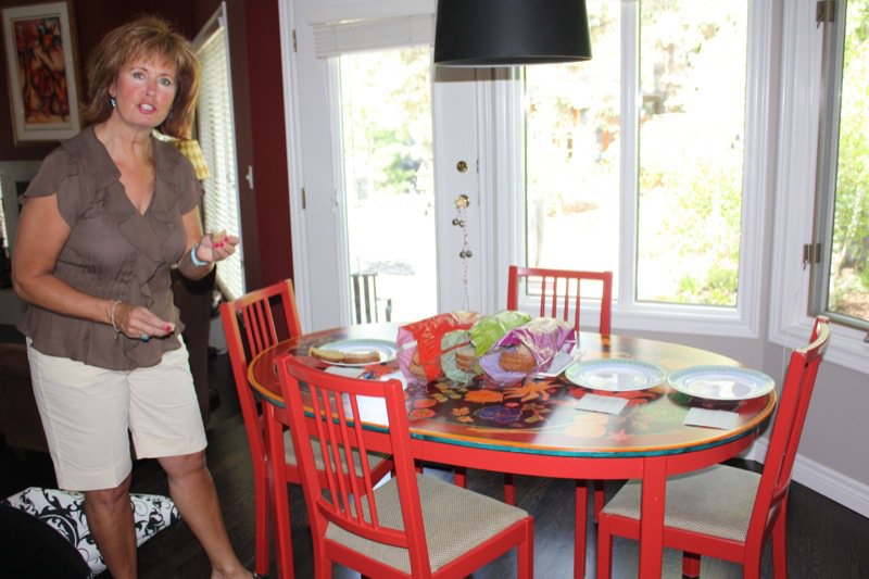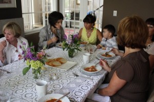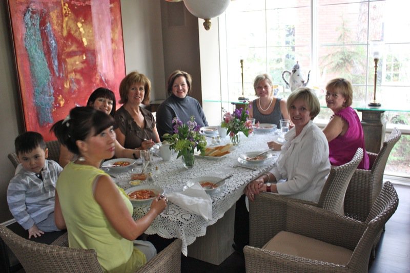 After all arrived, Janet served the most wonderful cold soup with a variety of tasty and colourful accompaniments that she had prepared from her finds at the Old Strathcona Farmer’s Marke,t on Saturday. We served ourselves then sat in her grand dining room to share in the lives of one another.