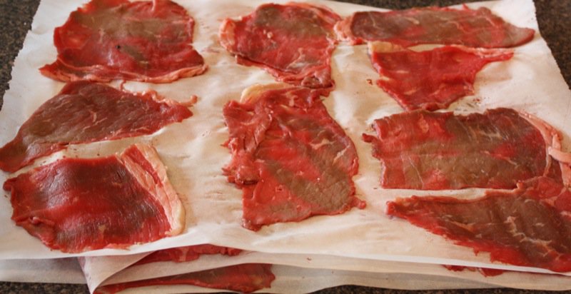 - 16 very thin slices of beef, or pork (I froze an inside round, and then we sliced it very thinly upon thawing)