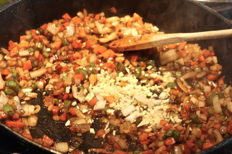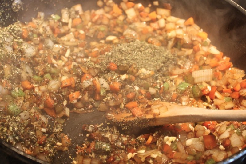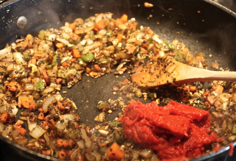 - Add garlic and stir in for about 30 seconds, then add tomato paste with the herbs and seeds, cooking and stirring until the vegetables are covered with the paste and it has thickened and browned a bit (about 2 minutes