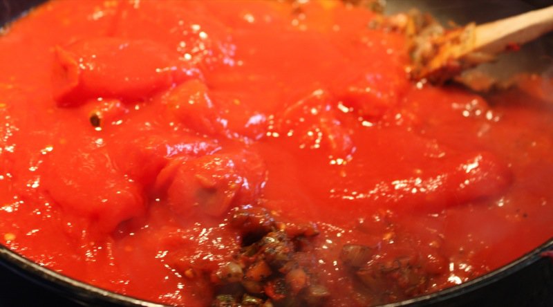Once all of the vegetables are coated with the herbs and the paste, in with the tomatoes. Really good tomatoes is essential to a really great sauce as they cook down and the distilled essence of the tomato flavour can really make the sauce sing. Or not.