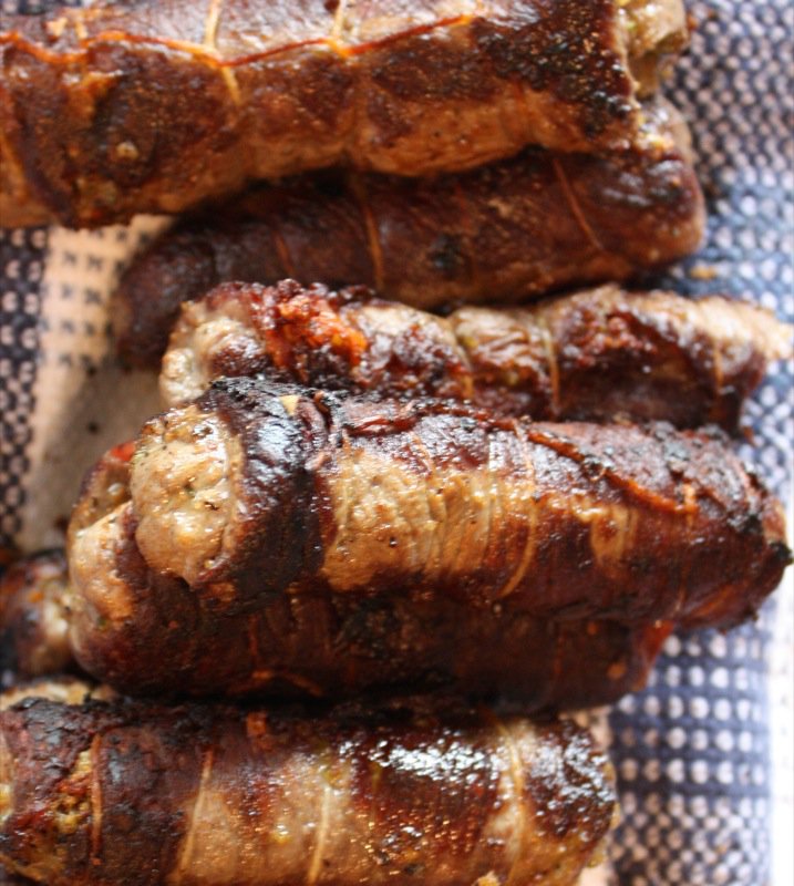 - Pound out the thin slices of meat; cover each with Jamon Serrano and pack on the filling