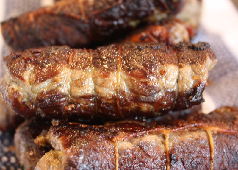 I bought an inside round roast, and froze it. We often do this when we need thinly sliced meat. Vanja is the best meat slicer I know… but this time really cut his finger! Chef Sous was out of commission with 6 stitches n his index finger! I layered the pieces on parchment and pounded them even flatter; covered each with our favourite Jamon Serrano from the Italian Centre Shop, and then a generous layer of the filling. I did not add aolive oil to my filling as I found that it was moist enough. I might add it if I was using it in a Bracili appetizer recipe. I still need to test the waters with this recipe further.